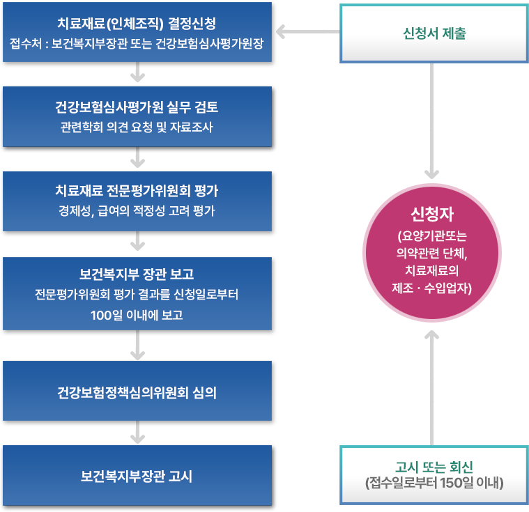 위 치료재료를 등재시키기 위한 신청절차를 “치료재료 결정”이라 하며 신고ㆍ인증ㆍ허가 후 30일 이내에 건강보험심사평가원에 신청하여