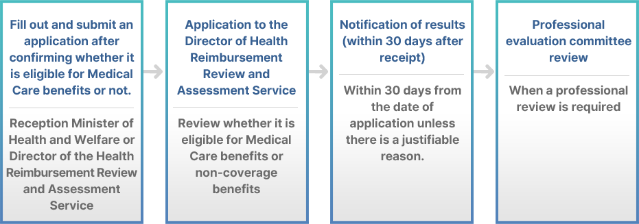 · The application system for confirmation of eligibility for health care benefits or non-benefit refers to the application for new medical technology evaluation under Article 53 of the 「Medical Service Act」 and the application for deferral of new medical technology evaluation under Article 3 of the 「Rules on New Medical Technology Evaluation」. This is a system to apply to the Minister of Health and Welfare for confirmation of whether or not an act is eligible for medical care covered benefits or non-covered benefits for an act whose the technology is unclear.